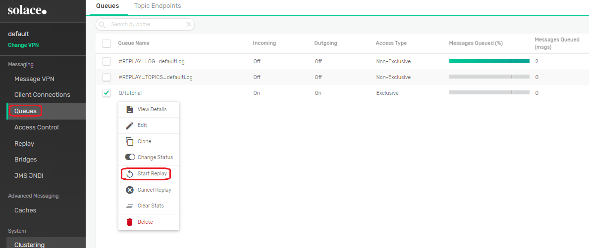 $ ./QueuePublisher <msg_backbone_ip:port> <vpn> <client-username> <password> Q/tutorial- Now start a replay from the message broker. The flow event callback monitors for a replay start event. When the message broker initiates a replay, the flow will see a
