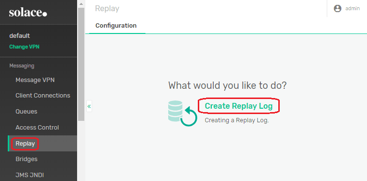 A replay log must be created on the message broker for the Message VPN using Message Replay CLI configuration or using Solace PubSub+ Manager administration console. Another option for configuration is to use the SEMP API.