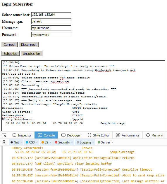 The following is a screenshot of the tutorial’s TopicSubscriber.html web page with the JavaScript debug console open in the Firefox browser. It captures the page after it was loaded and the “Connect” button was clicked and then the “Subscribe” button was clicked.