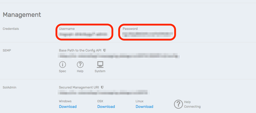 If connecting using Solace Cloud, obtain your management credentials by scrolling down to the Management section on the Connectivity tab
